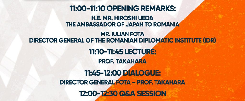 The online lecture is organized by the Embassy of Japan in Romania, the Romanian Diplomatic Institute and the Romanian-American University.