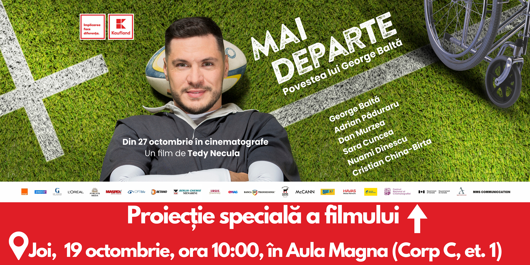 Filmul fenomen „Mai Departe”, care prezintă povestea reală a lui George Baltă, un jucător de rugby care rămâne paralizat pe teren în timpul meciului, vine la Universitatea Româno-Americană într-o proiecție specială, joi, 19 octombrie, ora 10:00, în Aula Magna (Corp C, etaj 1).