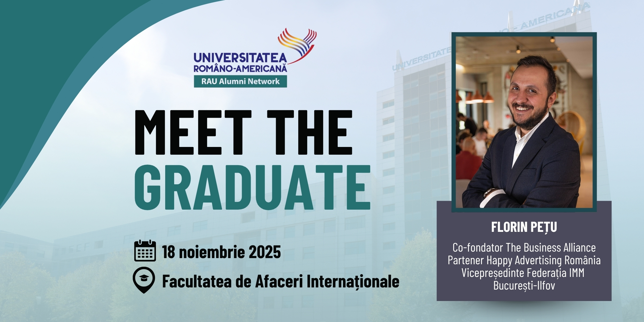 Pe 18 noiembrie, studenții Facultății de Afaceri Internaționale din cadrul Universității Româno-Americane au avut ocazia să îl întâlnească pe Florin Pețu, absolvent al promoției 2008 și unul dintre cei mai dinamici profesioniști ai generației sale în domeniul marketingului digital și antreprenoriatului din România.