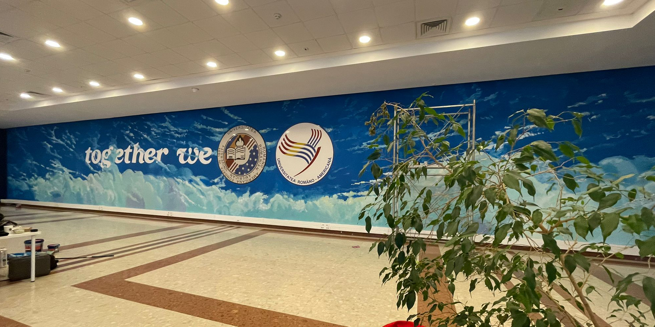 Probabil că ați văzut deja ce se întâmplă în holul principal al universității noastre! Artista noastră a pictat prima parte a proiectului „Together we are”! Cum face continuarea?